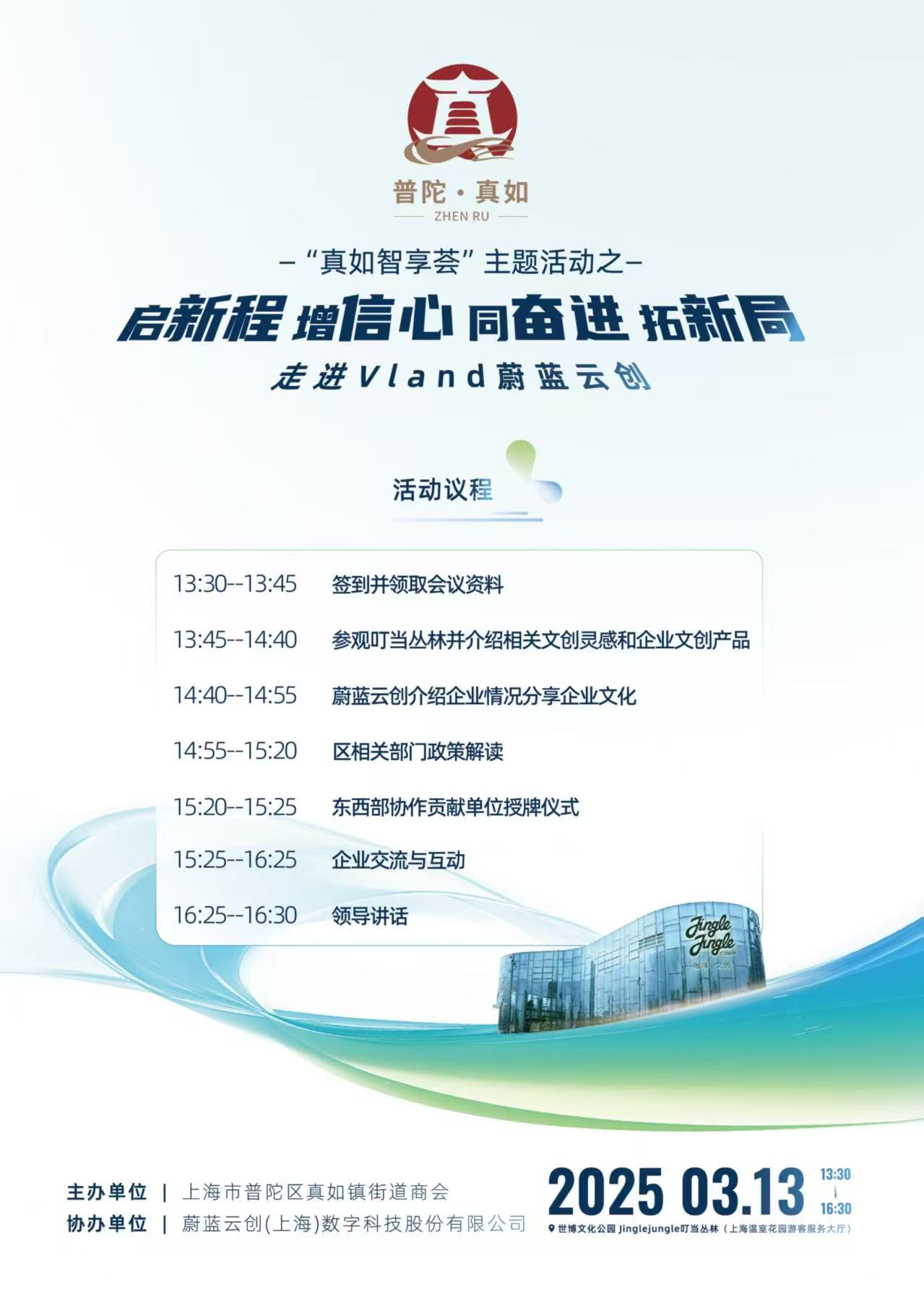 2025 年 3 月 13 日,由上海市普陀區(qū)真如鎮(zhèn)街道商會主辦,蔚藍(lán)云創(chuàng)(上海)數(shù)字科技股份有限公司協(xié)辦的 “真如智享薈” 主題活動 ——“啟新程 增信心 同奮進(jìn) 拓新局 走進(jìn) Vland 蔚藍(lán)云創(chuàng)” 在世博大公國 jinglejungle 叮當(dāng)叢林(上海藍(lán)花園游客服務(wù)大廳)順利舉行。眾多企業(yè)代表齊聚一堂,我司總經(jīng)理俞宏南也出席了此次活動,共同探索行業(yè)發(fā)展新機(jī)遇。