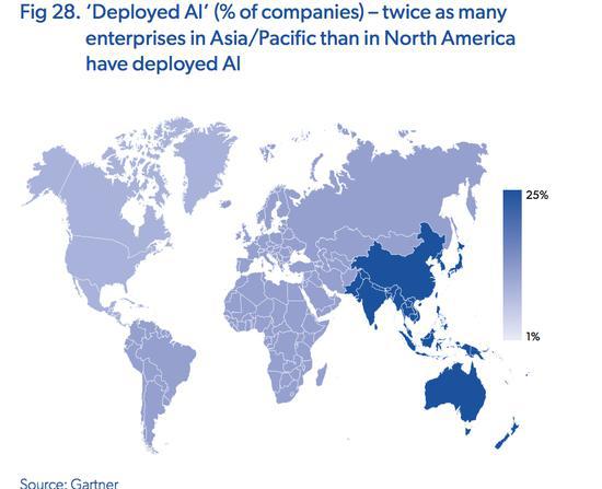 上述報告顯示,亞太地區(qū)采用AI技術企業(yè)的數(shù)量是北美地區(qū)公司的兩倍。其中,中國公司引領亞太AI,北京、上海、廣東以及浙江和江蘇是主要的聚集地。