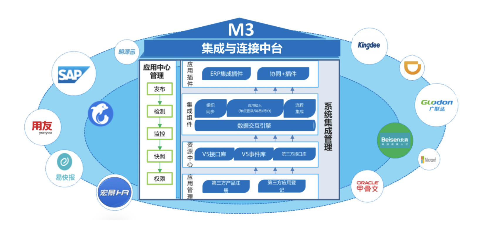 3、應(yīng)用集成。集成第三方系統(tǒng)的消息/待辦到V5協(xié)同工作桌面;第三方系統(tǒng)的單點登錄;第三方系統(tǒng)整體或業(yè)務(wù)功能集成到V5門戶;V5門戶或功能集成到第三方系統(tǒng)等。